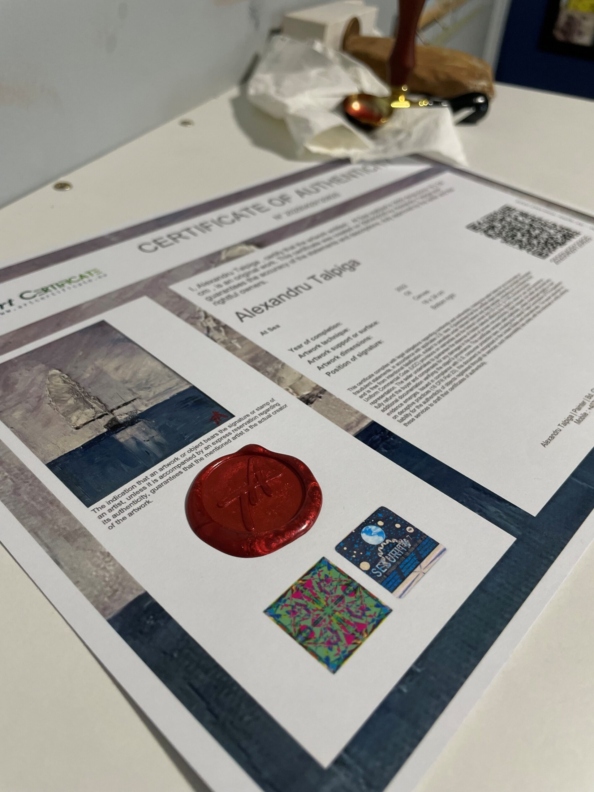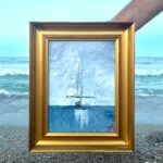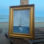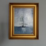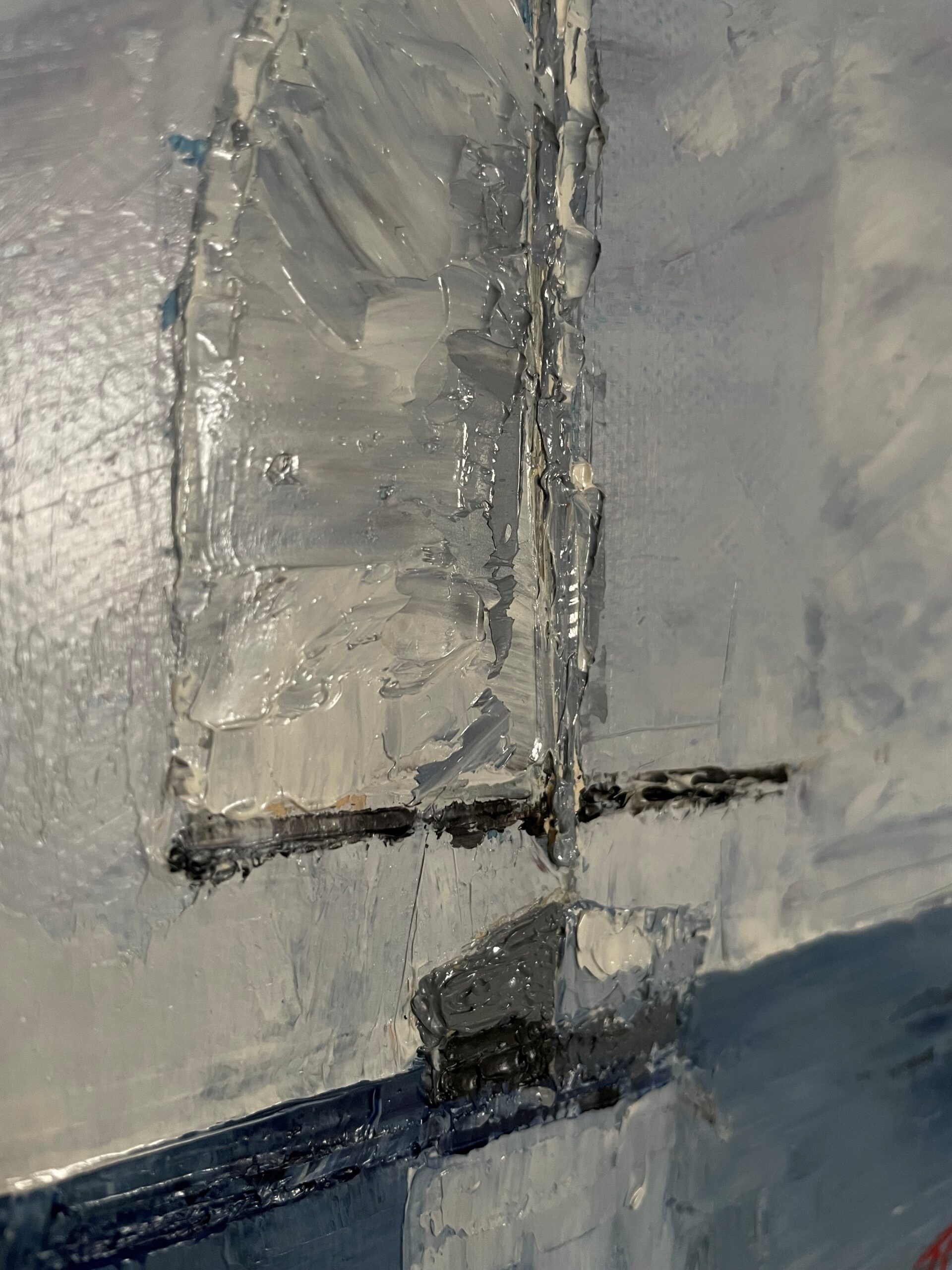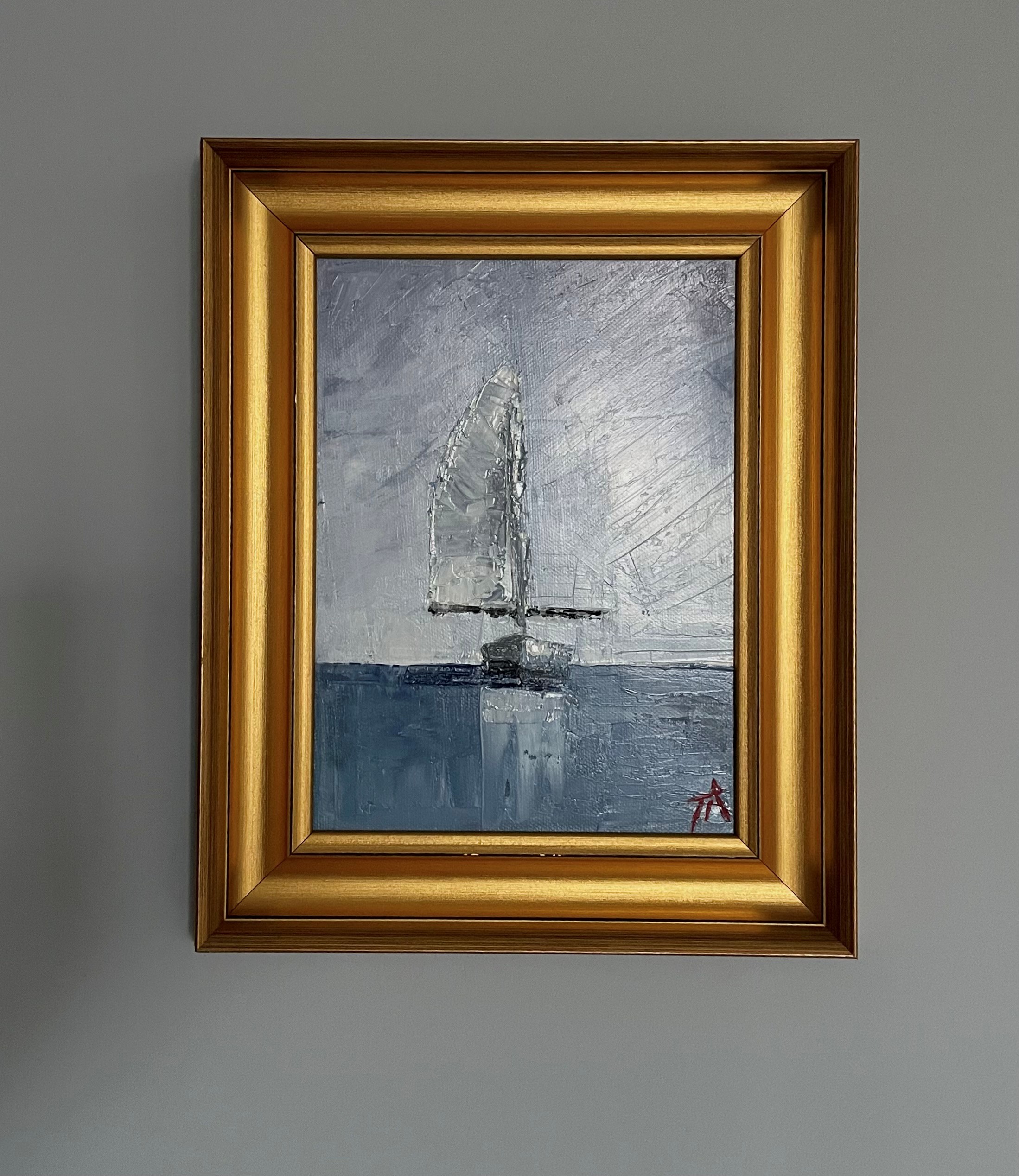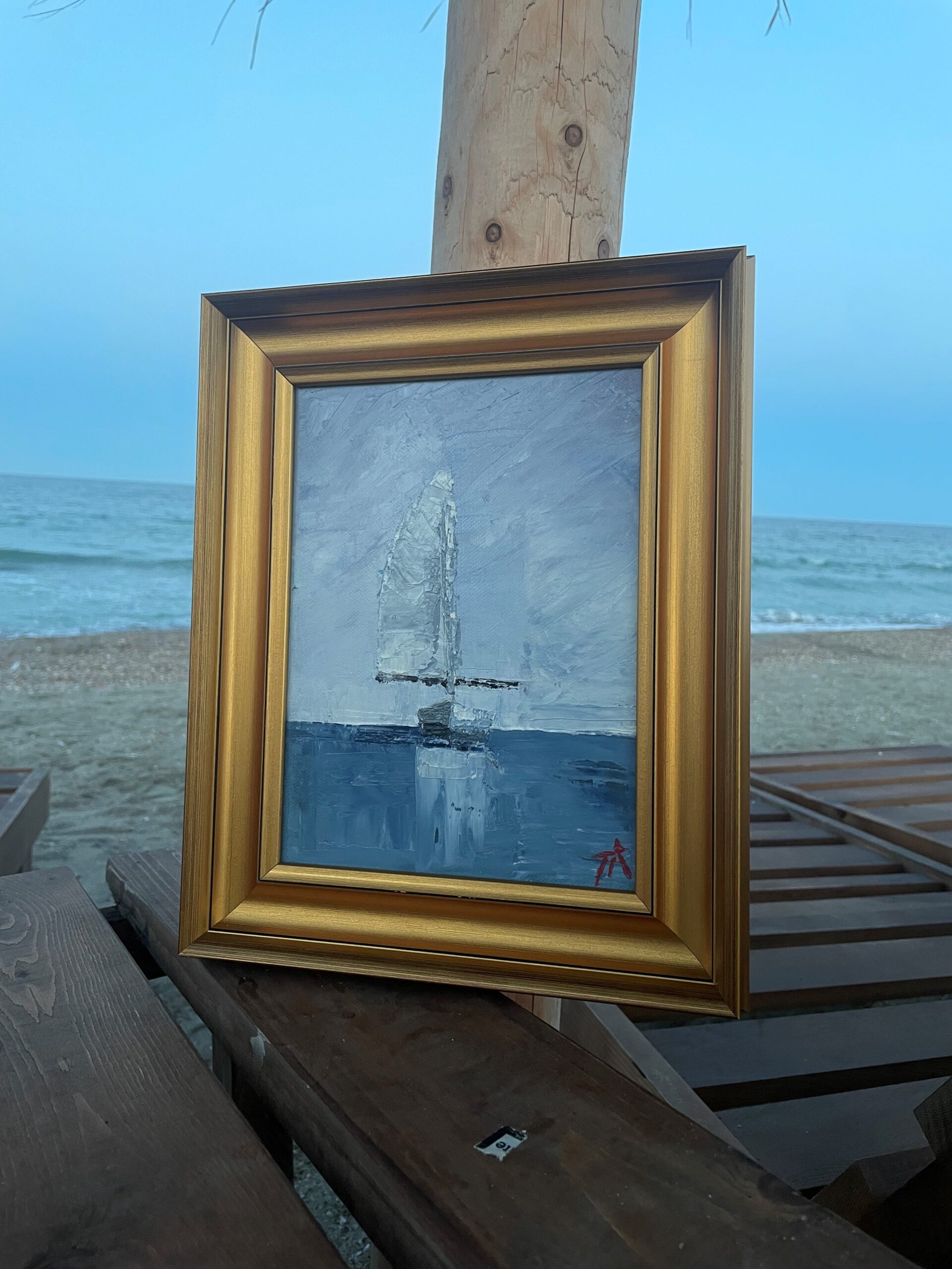 O barcă solitară avansează lent către privitor, plutind pe o apă liniștită sub o lumină difuză de zi ușor înnorată. Suprafețele dense de pastă și urmele gesturale ale cuțitului conferă lucrării o energie subtilă, impresionistă, unde textura devine limbaj vizual. Reflexiile reci și atmosfera calmă invită la contemplare, sugerând liniștea unei călătorii interioare.